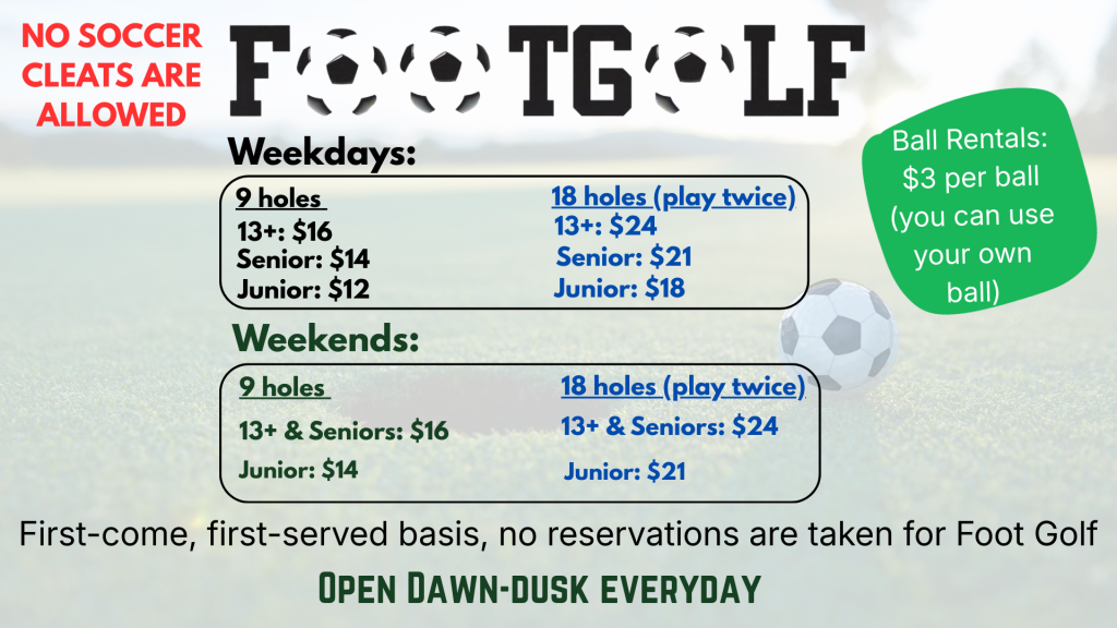 ATTENTION FOOTGOLFERS – Due to continuous damage to our greens, NO SOCCER CLEATS ARE ALLOWED on the golf course. KEEP OFF the golf course greens during your round of FootGolf.