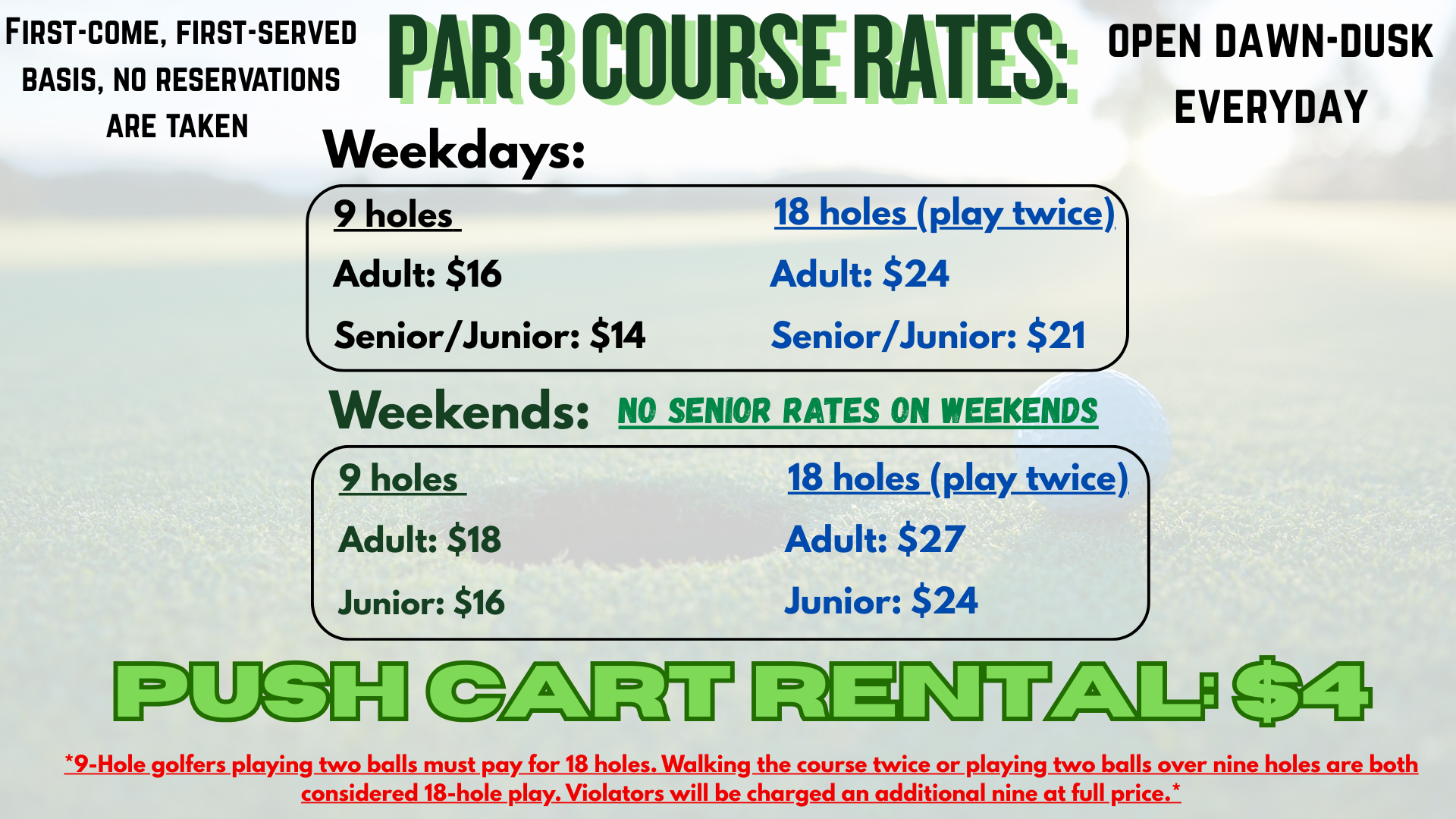 - Course Hours – Open every day from dawn until dusk (except for flooding, snow, or bad turf conditions)